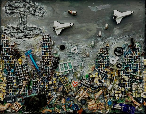 Gegenstände, Abfall und Spielzeug auf Leinwand